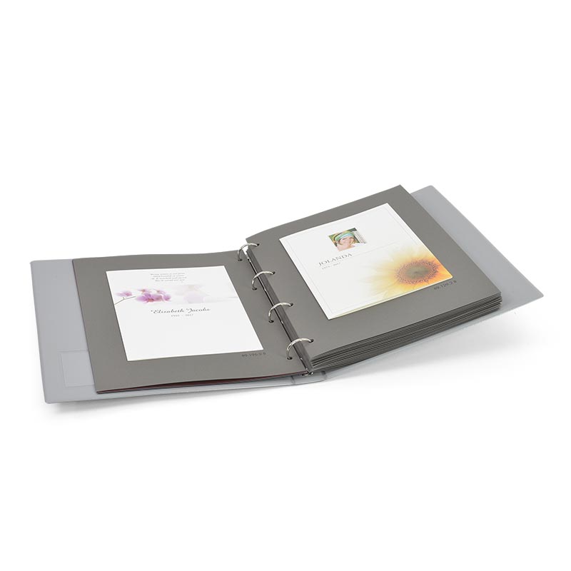 A4+ mappen met een ovale stans voor de bedrijfsnaam en/of logo van de uitvaartonderneming. De uitvaartondernemer kan hierin zijn of haar collectie rouwbrieven presenteren. Verkrijgbaar in de kleuren zwart, rood, blauw en grijs. FamilyCards verzorgt indien gewenst, het inplakken van de door u gekozen rouwbrieven. Afwijkende formaten en kwaliteiten met klanteigen buitendruk behoren tot de opties. Vraag naar de mogelijkheden.